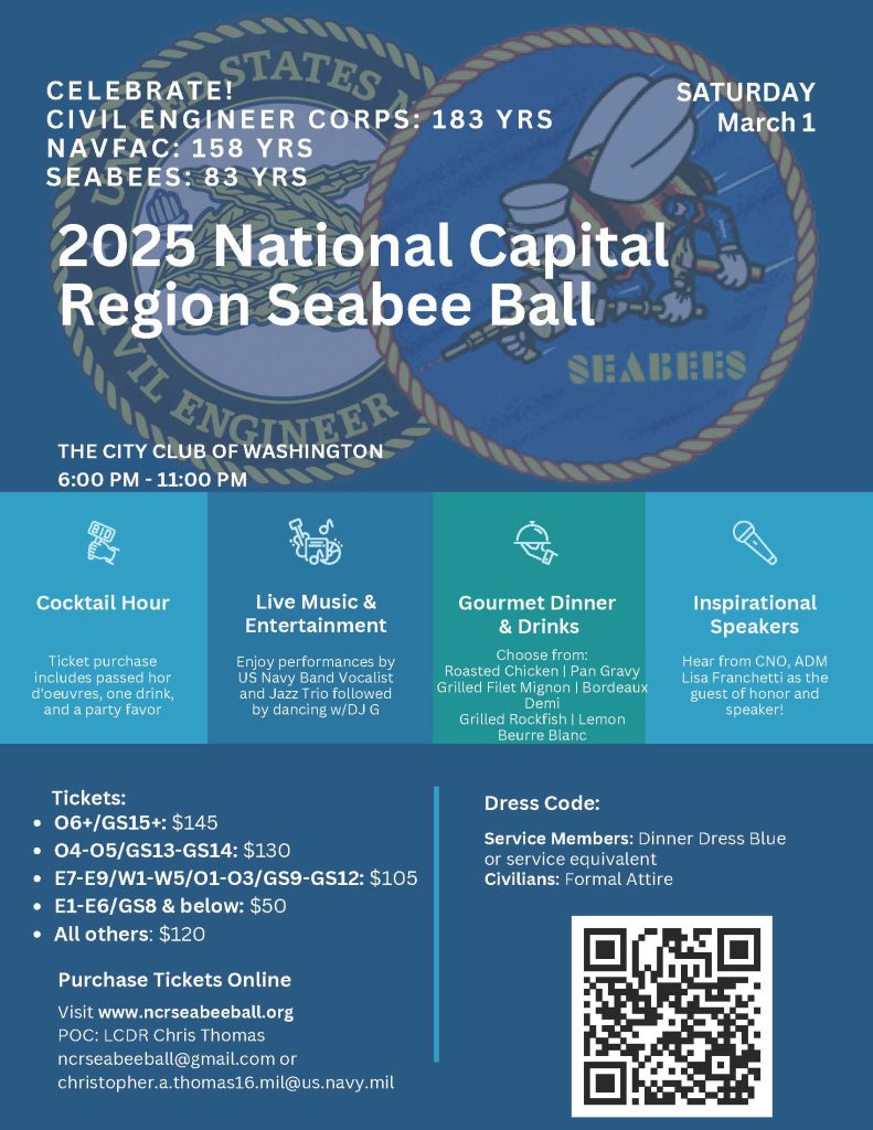 Join in on the fun at the 2025 National Capital Region Seabee Ball on Saturday, March 1 from 6 pm to 11 pm at the City Club of Washington, Washington, DC. SAME Members :: Submit your request to sit with other SAME attendees when you register for this event.