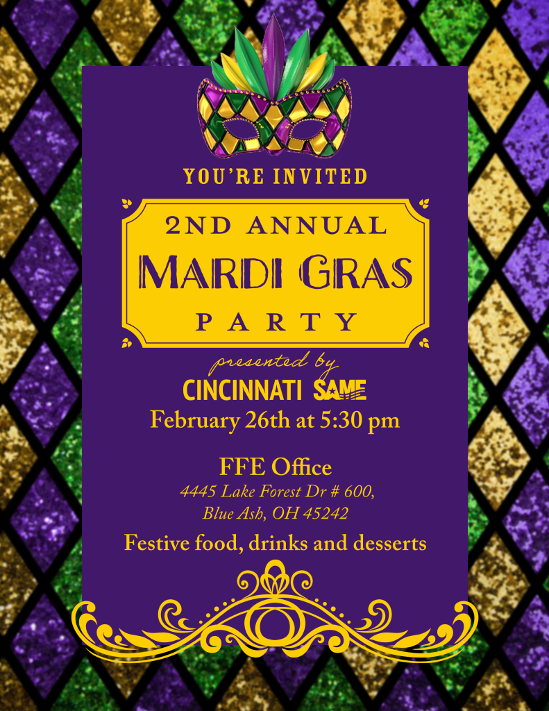 Please join us for the 2nd Annual SAME Cincinnati Mardi Gras Party! Grab your most vibrant Mardi Gras gear and join us in the festivities. Food, drinks, and desserts will be provided.
