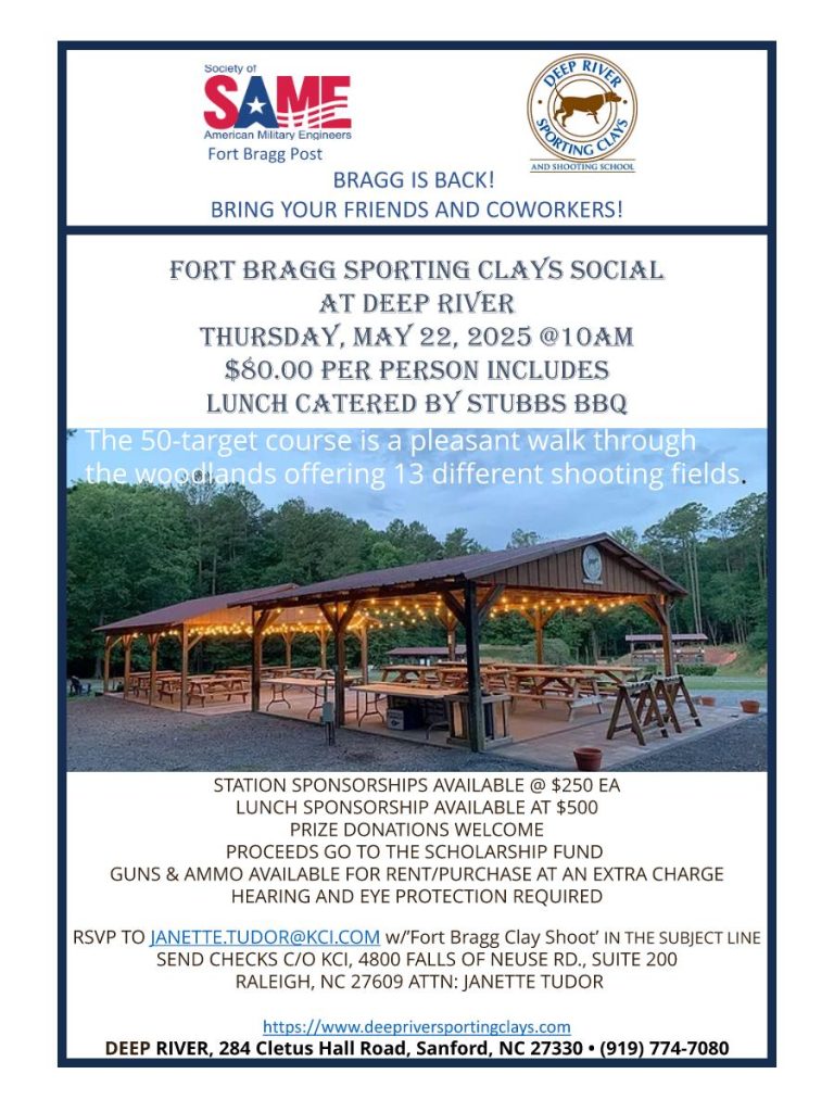 **Attention: please note the change of date** Please join the SAME Fort Liberty (Bragg) Post for our annual sporting clays social on May 22, 2025 at Deep River Sporting Clays in Sanford, NC. Bring your friends and coworkers to enjoy a pleasant walk through the woodlands to 13 different shooting fields. Registration fee includes a catered lunch by local favorite, Stubbs BBQ. Proceeds from the event support our Post’s annual scholarship fund.