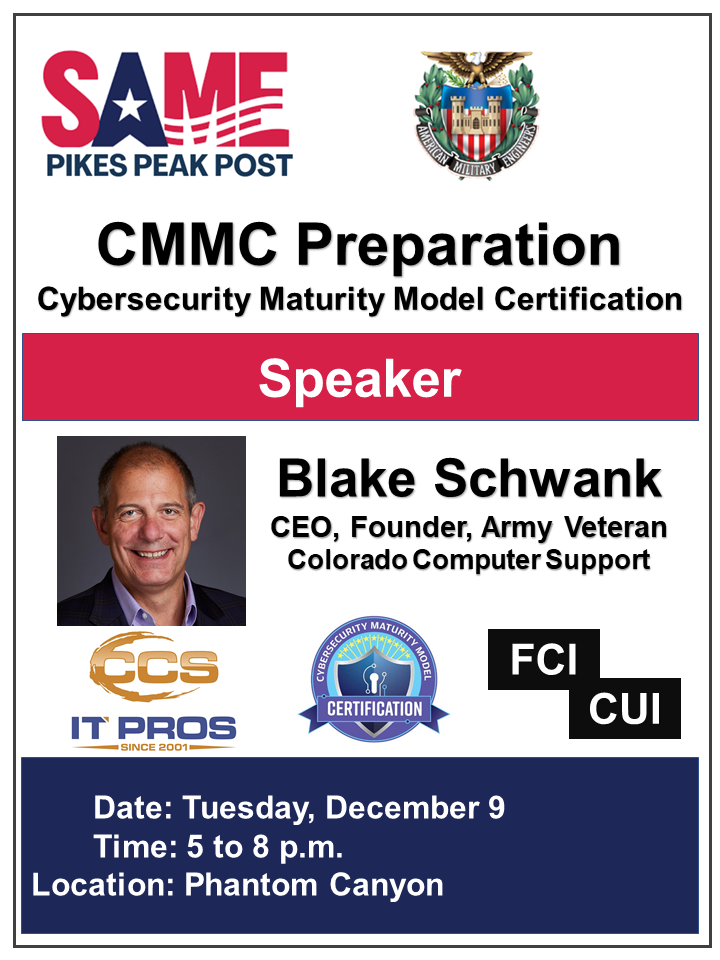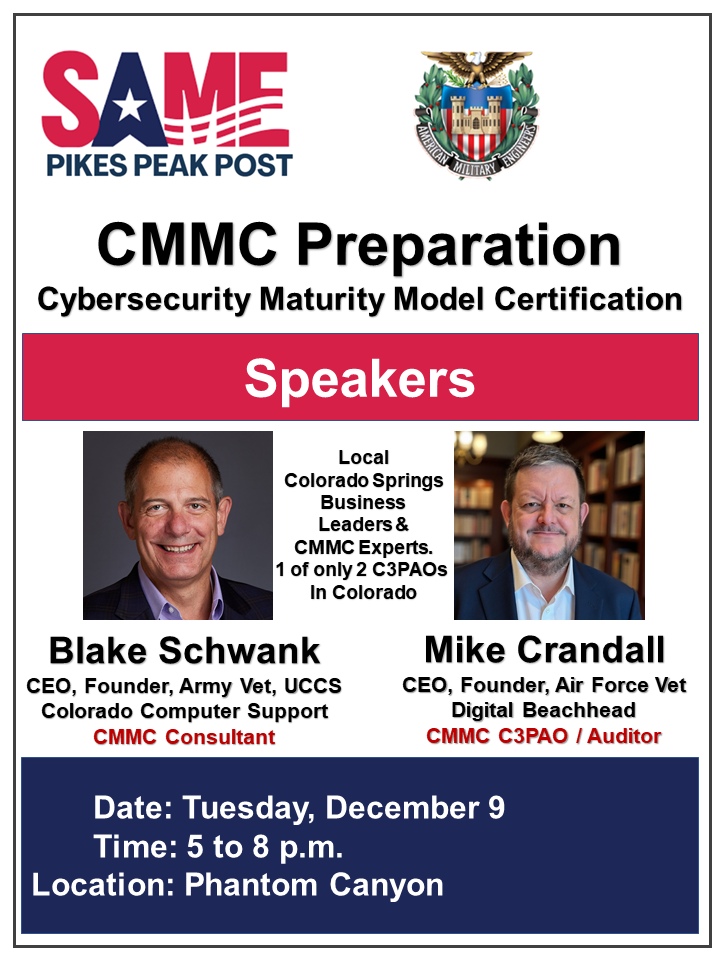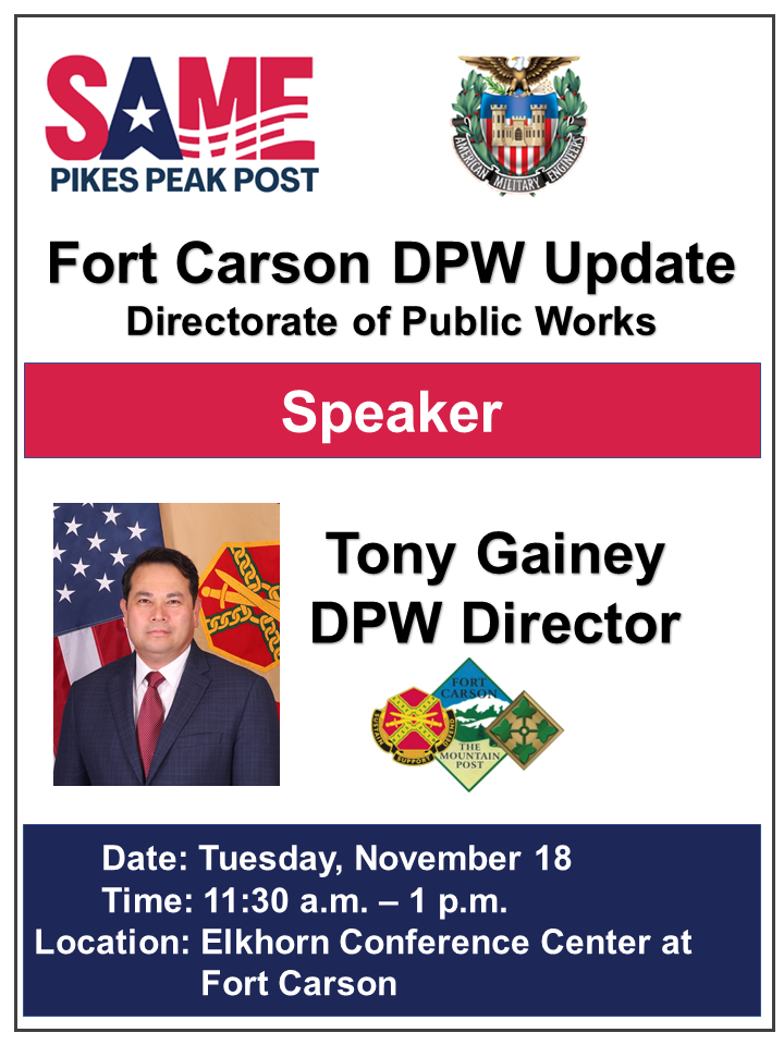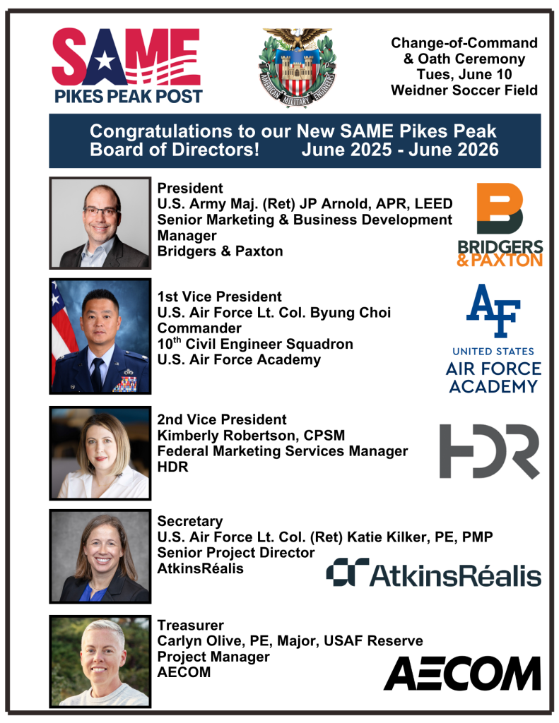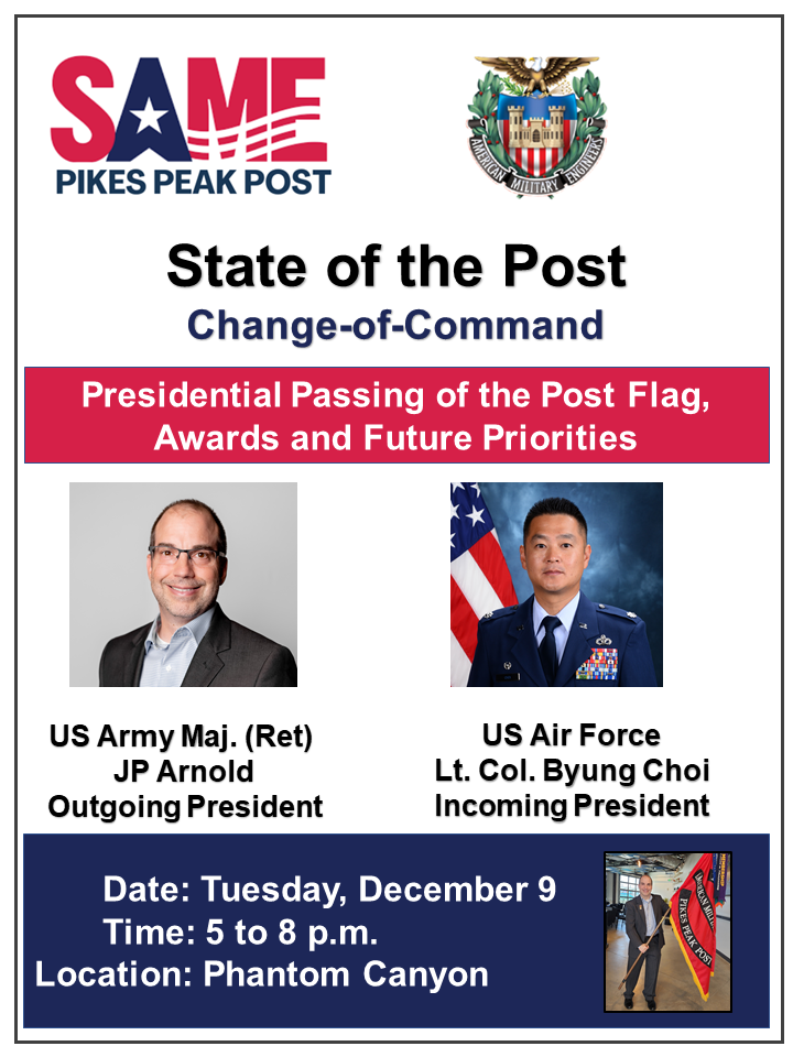 The Pikes Peak Post accomplishes this goal locally by supporting monthly luncheon meetings and other professional/social activities attended by members of local government, military, private industry, students and other interested parties. These meetings are announced via our e-mail distribution list and quarterly newsletter. We are supported by the national Society of American Military Engineers and publications such as The Military Engineer, which also promotes the interests and goals of our society and its members. Please peruse our website to discover the benefits of SAME Pikes Peak Post membership.