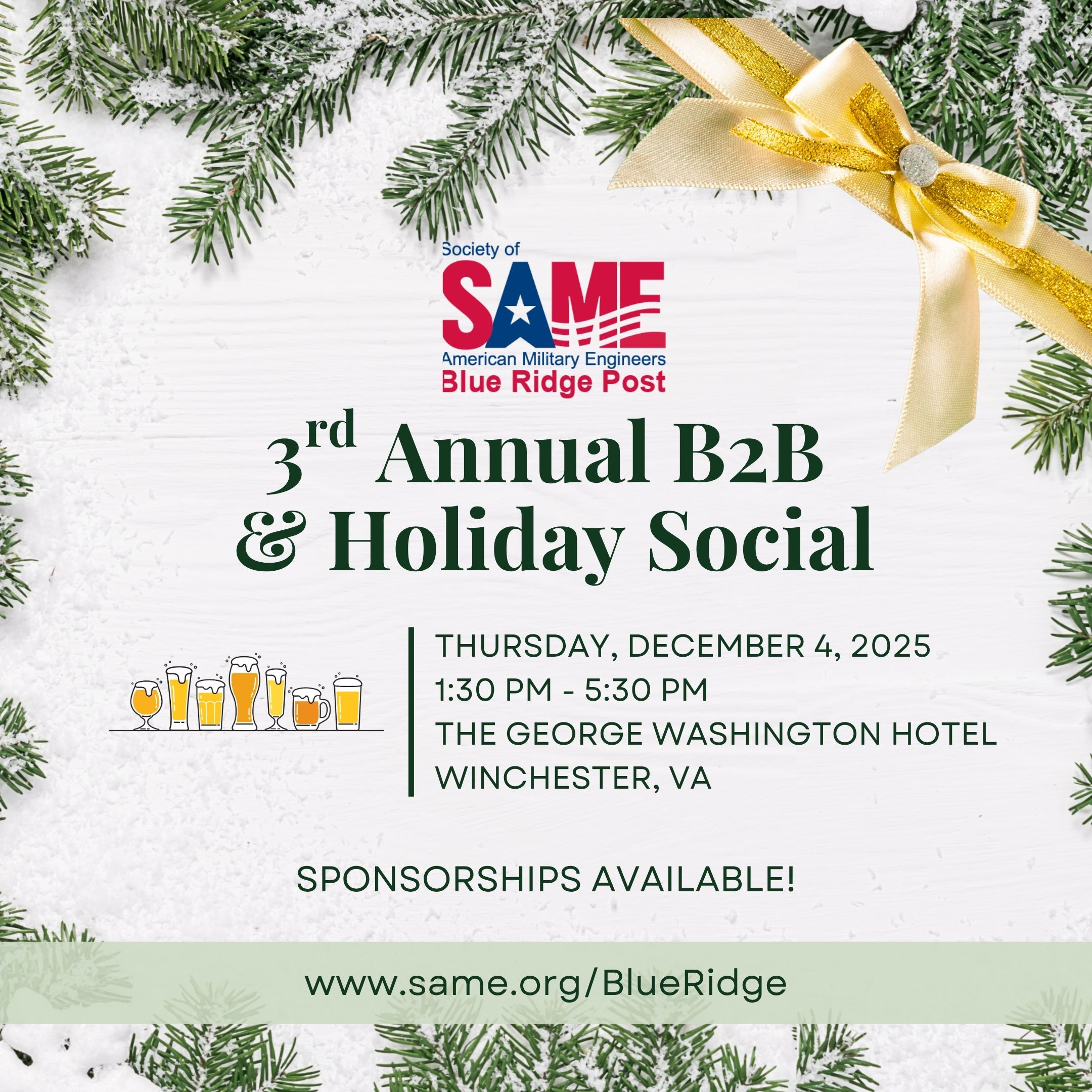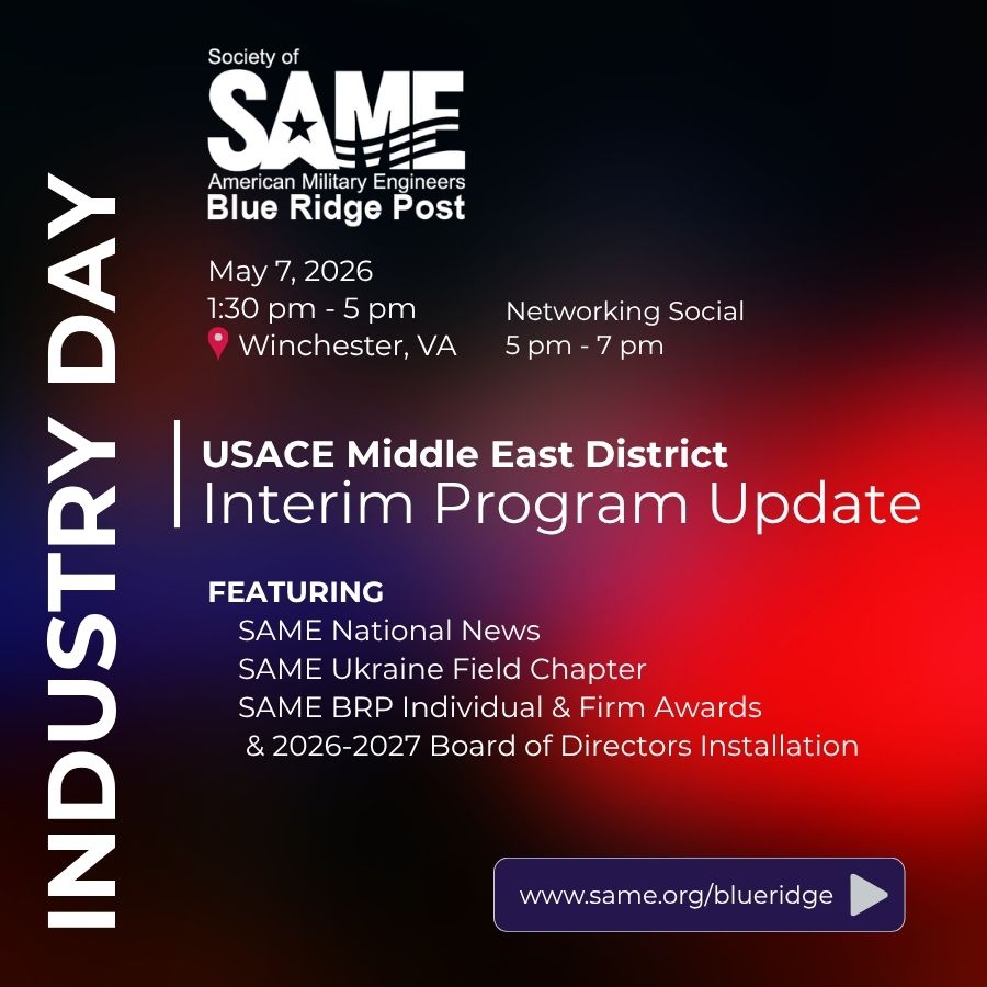 Since 1978, the SAME BLUE RIDGE POST (BRP) serves the Society of American Military Engineers (SAME) members located in the Mid-Atlantic Region, and often collaborates with the USACE Transatlantic Expeditionary Division located in 📍Kuwait and USACE Middle East District, as well as other local government agencies near 📍Winchester, VA.