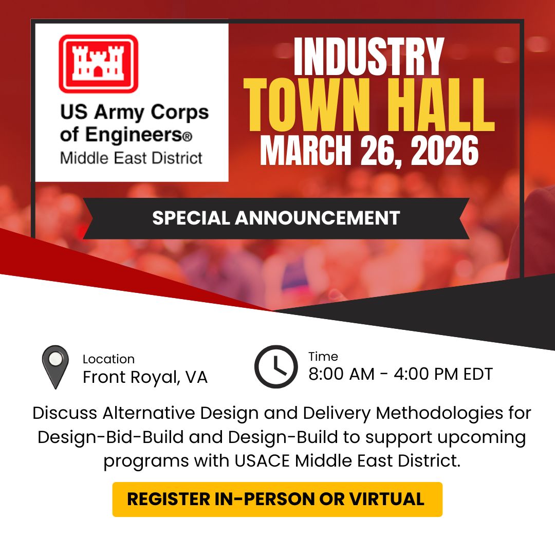 USACE Middle East District “Town Hall / Reverse Industry Day” Pioneering Alternate Design & Delivery Methodologies (ADDM) The U.S. Army Corps of Engineers (USACE) Middle East District invites architecture, engineering, and construction professionals to participate in a unique Town Hall / Reverse Industry Day focused on rethinking how complex projects are delivered across the U.S. […] -