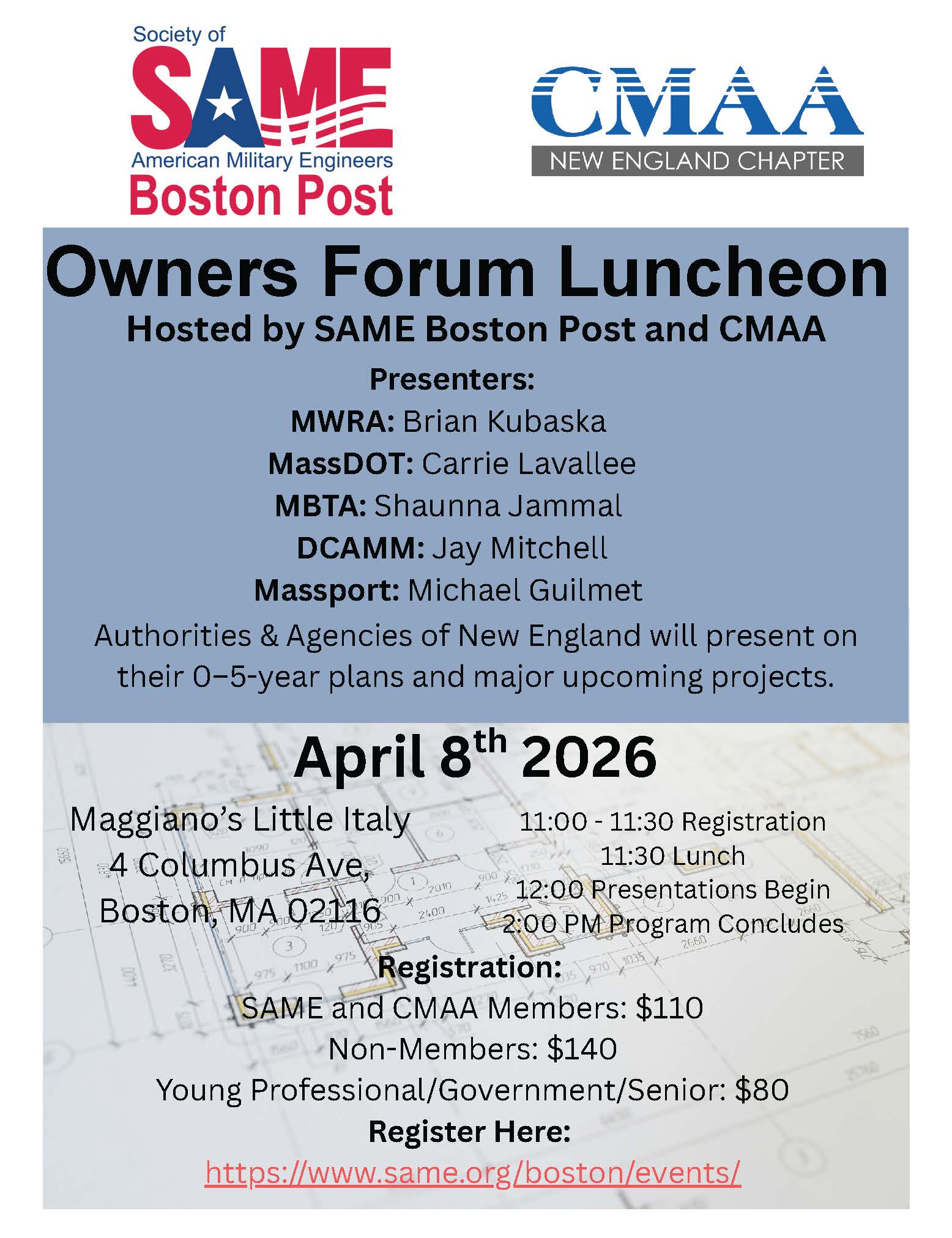 Please join us on April 8 for the SAME Boston Post’s annual luncheon event with CMAA New England, this year with an “Owner’s Forum” theme. Our presenters, who will outline their agency’s plans and major upcoming projects for the next five years, will include: MWRA: Brian KubaskaMassDOT: Carrie LavalleeMBTA: Shaunna JammalDCAMM: Jay MitchellMassport: Michael Guilmet […] -