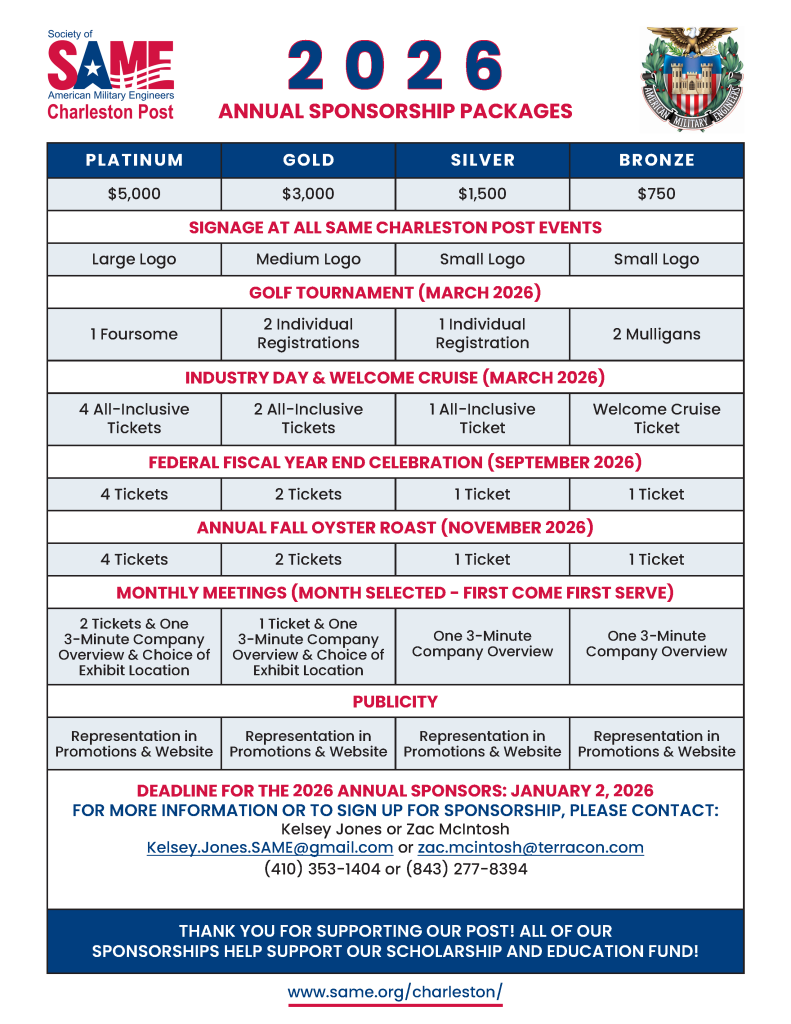 The Charleston Post accomplishes this goal locally by supporting monthly luncheon meetings and other professional/social activities attended by members of local government, military, private industry, students and other interested parties. These meetings are announced via our e-mail distribution list and quarterly newsletter. We are supported by the national Society of American Military Engineers and publications such as The Military Engineer, which also promotes the interests and goals of our society and its members. Please peruse our website to discover the benefits of SAME Charleston Post membership.