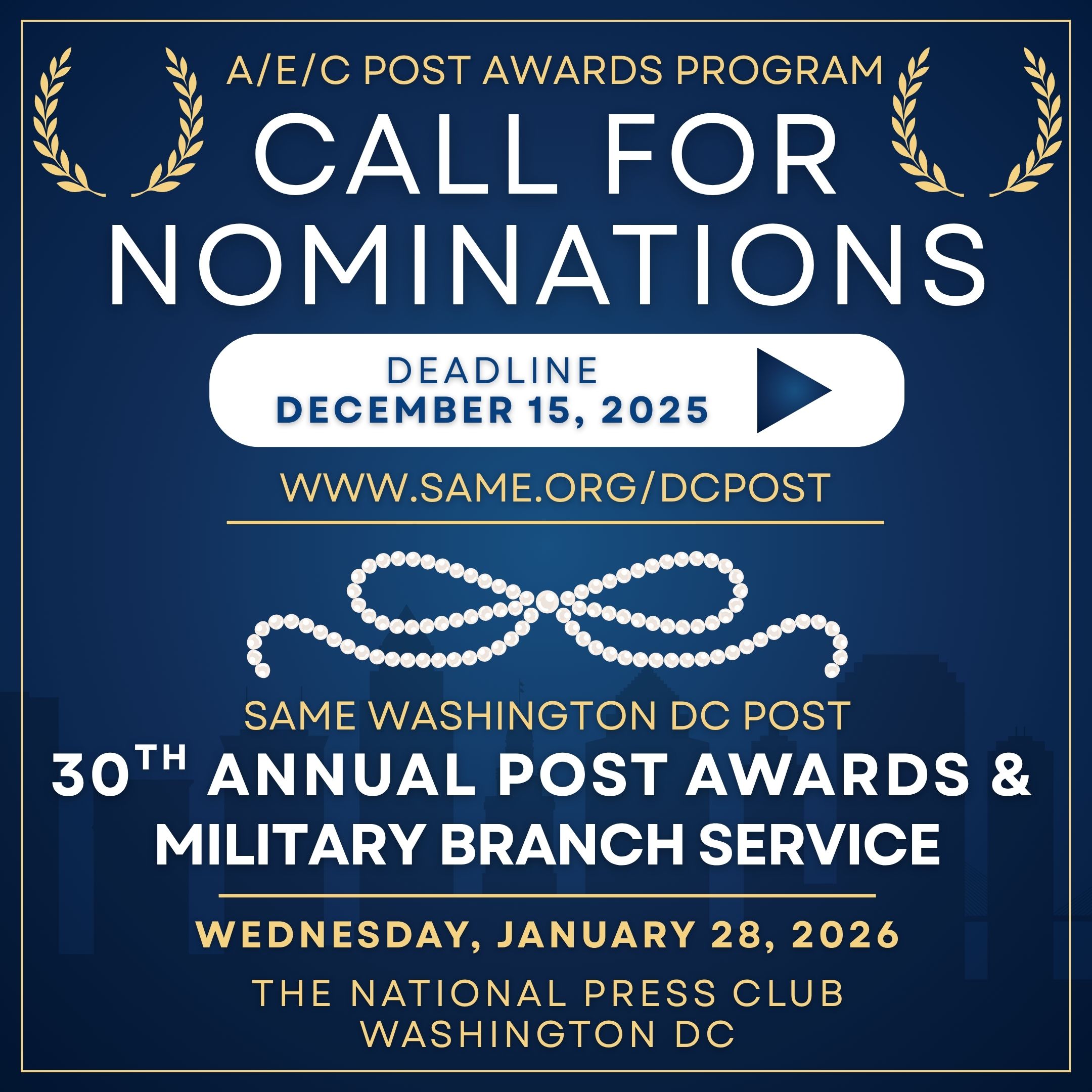 Wednesday, January 28, 2026 | 6 pm – 10 pm | The National Press Club | Washington, DC | On January 28, 2026, the SAME Washington DC Post will proudly host the 30th Annual Awards Program at the National Press Club, bringing together military, government, and A/E/C industry professionals to celebrate outstanding contributions to SAME and the broader engineering and […] -