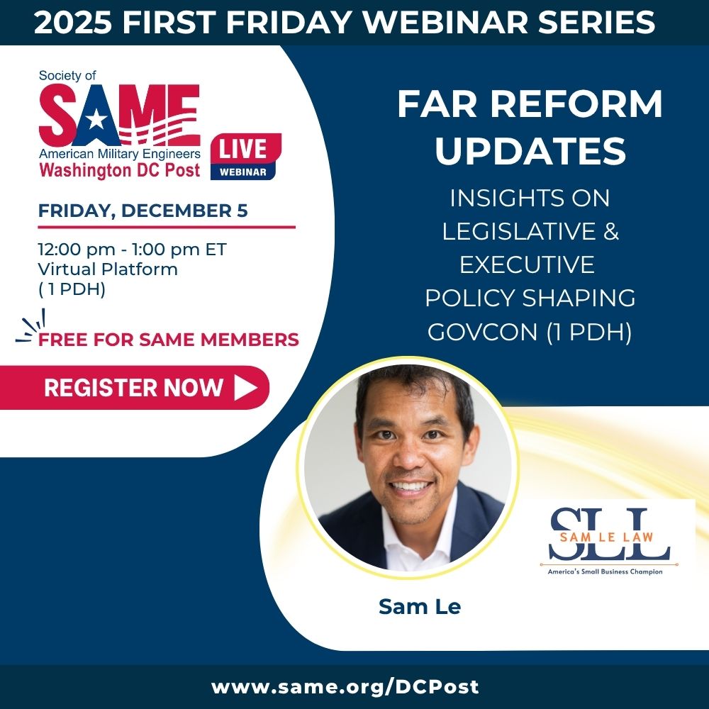 Registration opens on Nov. 6 at 1:00 pm ET. Join the SAME DC Post for this month’s virtual First Friday Webinar “FAR Reform Updates: Insights on Legislative and Executive Policy Shaping GovCon” (1 PDH) featuring speaker, Sam Le, Sam Le Law PLLC (12:00 pm – 1:00 pm ET). Free for SAME Members (any Post) and […] -