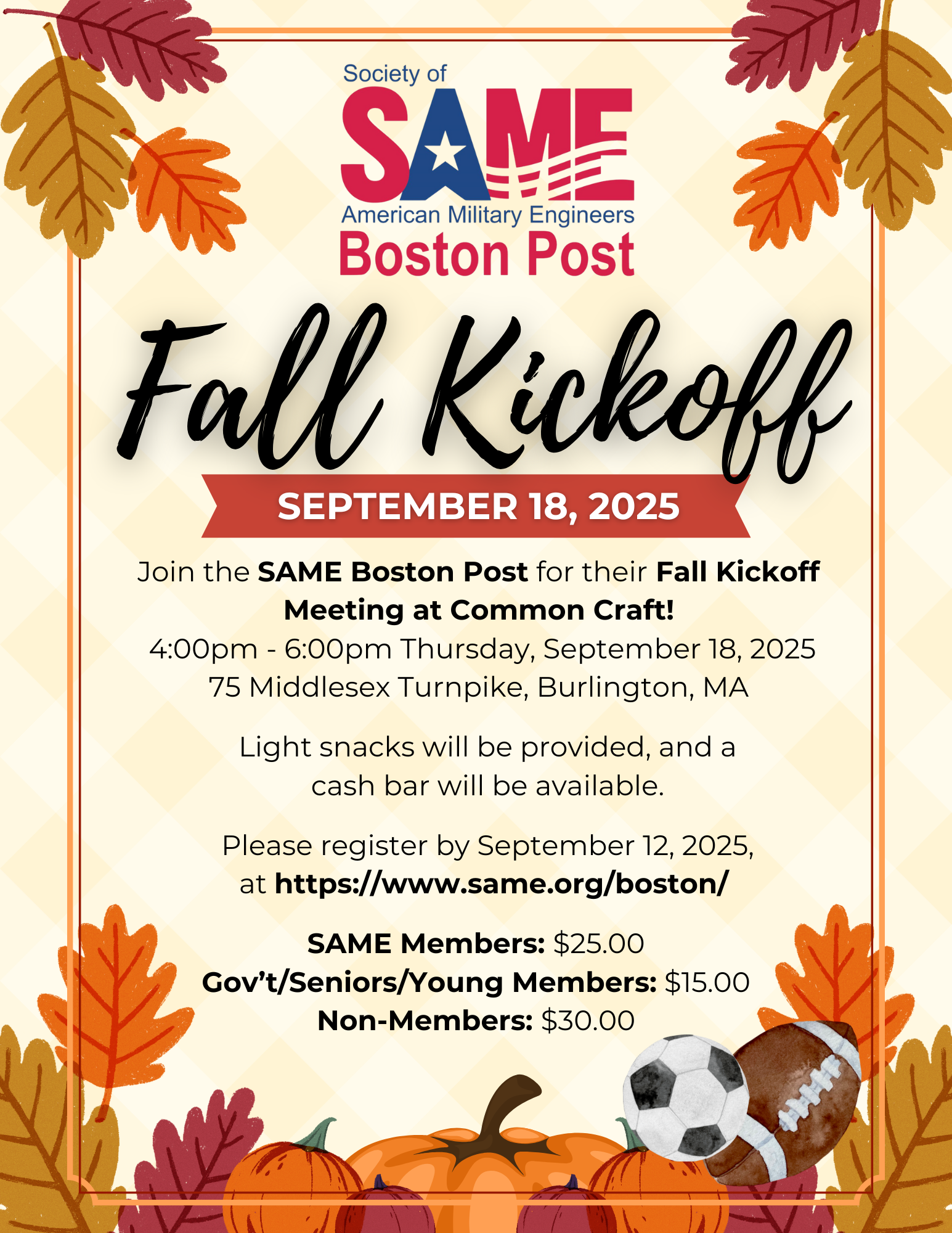 For a fun way to celebrate the cooler fall weather with style, please join the SAME Boston Post for our Fall Kickoff and Networking Event at Common Craft in Burlington from 4-6pm.