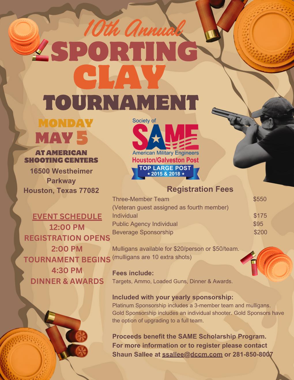 Join us for the 10th Annual SAME Houston/Galveston Post Sporting Clay Tournament supporting Scholarships on May 5th!