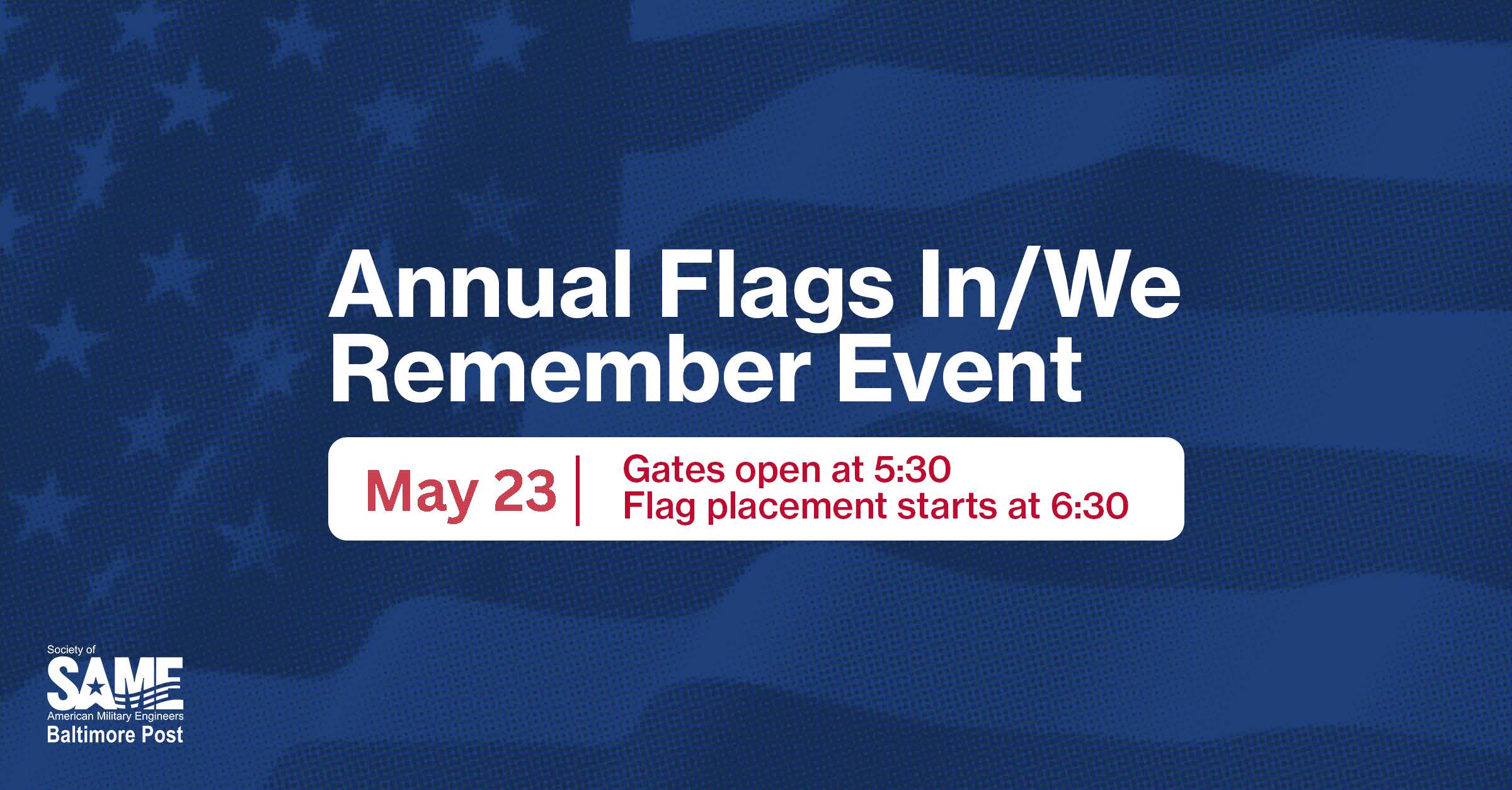 Join us on Friday, May 23rd for our annual flags in/we remember event to place flags on veteran graves at Baltimore National Cemetery. This annual precursor to Memorial Day is an important reminder of those who served our country and/or paid the ultimate sacrifice for our freedom and served our country. As with years past, a formal ceremony will follow the installation of flags. The ceremony is expected to commence around 6:15 PM and end with the ceremony at 7 PM.