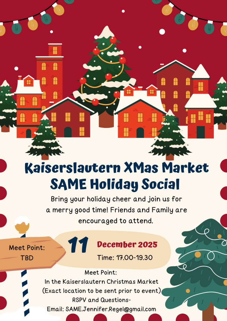 Join our Kaiserslautern Post members to socialize and celebrate the holidays on Thursday, 11 December from 1700-1930 at the Kaiserslautern Weihnachtsmarkt (Christmas Market). Family and friends are invited and encouraged to attend.