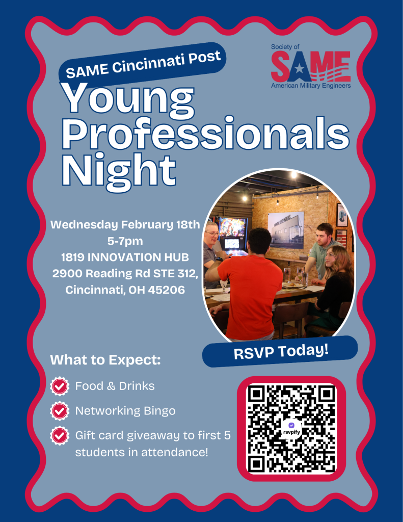 Cincinnati SAME welcomes you to attend our annual Young Professionals Night. This is an awesome opportunity for students and young professionals in the AEC (Architecture, Engineering, and Construction) industry to network with mentors in the Cincinnati area. Enjoy complimentary refreshments, play Networking Bingo, and try your luck at winning a gift card!