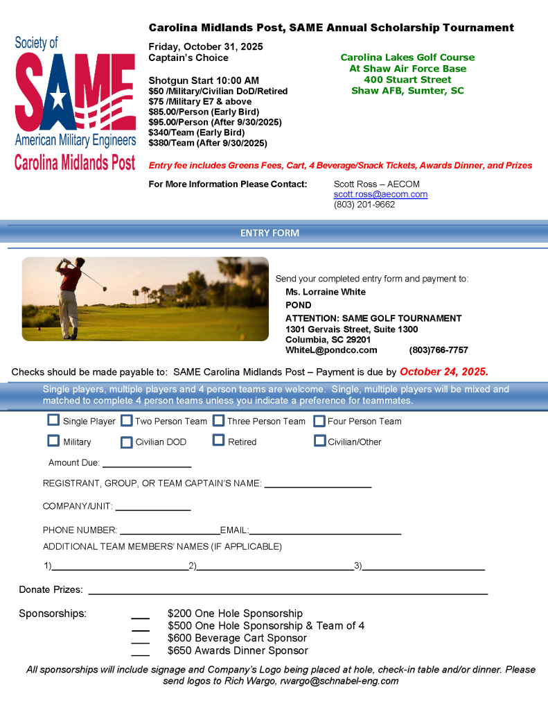 We have our SAME Annual Scholarship Golf Tournament planned for Friday, October 31st at Carolina Lakes Golf Course at Shaw AFB.