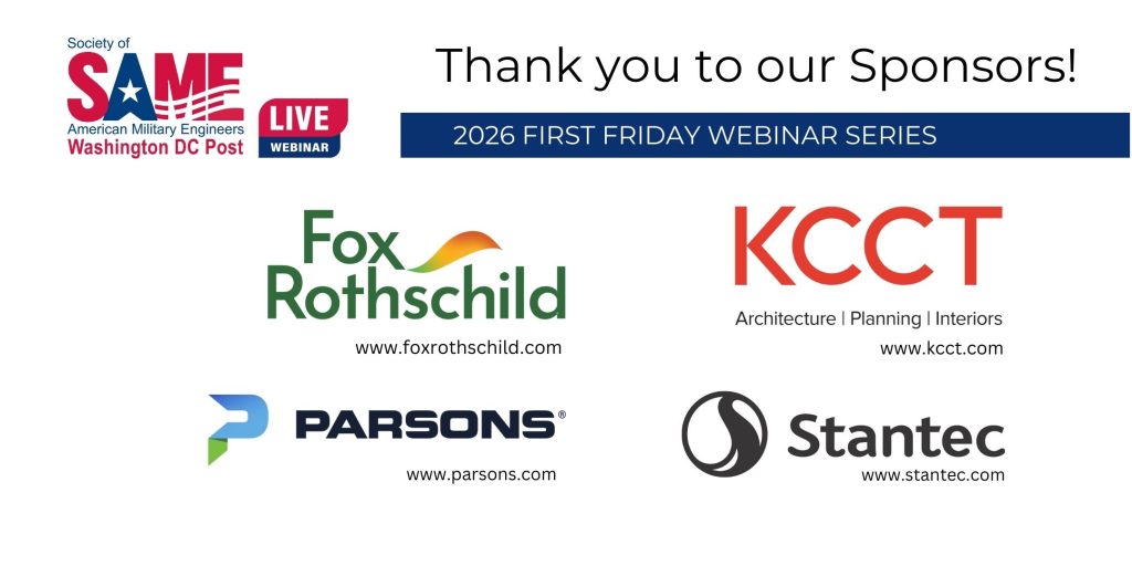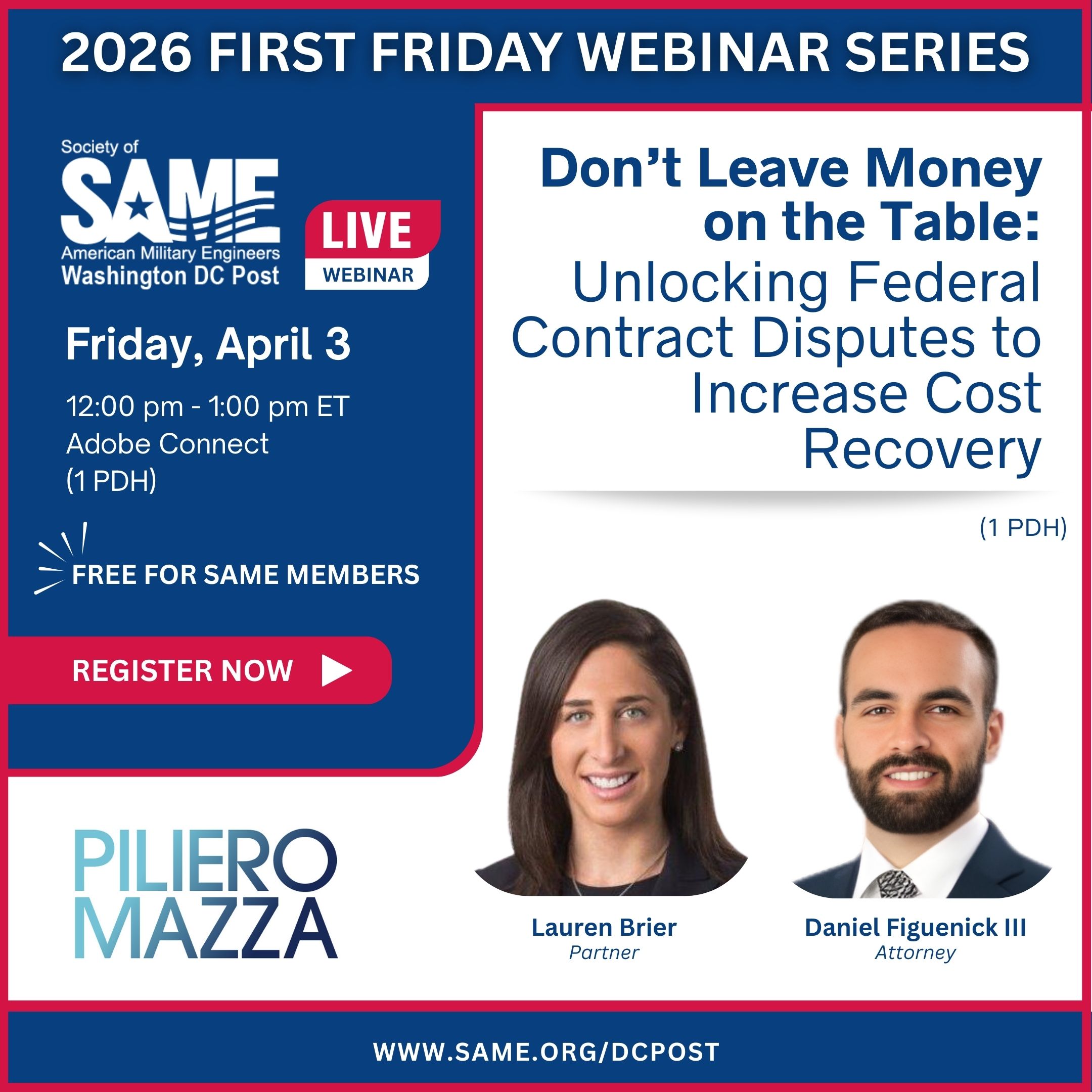 Registration opens on March 6 at 1:00 pm ET. *** Join the SAME DC Post for this month’s virtual First Friday Webinar “Don’t Leave Money on the Table: Unlocking Federal Contract Disputes to Increase Cost Recovery” (1 PDH) featuring Lauren Brier, Partner, and Daniel Figuenick III, Attorney, PilieroMazza PLLC (12:00 pm – 1:00 pm ET). Free for SAME Members (any Post) and Students; $25 for non-members. Sponsorship for this event is available through annual or event sponsorship. Contact: Bree Beal, samedcprograms@gmail.com
