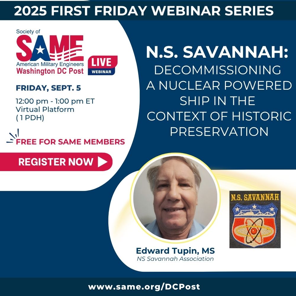 Registration opens on Aug. 1 at 1:00 pm ET. Join the SAME DC Post for this month’s virtual First Friday Webinar “N.S. Savannah: Decommissioning a Nuclear Powered Ship in the Context of Historic Preservation” (1 PDH) featuring speaker, Edward Tupin, MS – N.S. Savannah Association (12:00 pm – 1:00 pm ET). Free for SAME Members (any Post) and Students; $25 for non-members. Sponsorship for this event is available through annual or event sponsorship. Contact: Bree Beal, samedcprograms@gmail.com