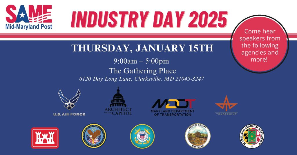 Join the SAME Mid-Maryland Post for an Industry Day on January 15th, featuring speakers from Federal and State Agencies! Our overall mission for this event is to foster Industry-Government Engagement (IGE) within and outside the Mid-Atlantic region. Our goal is to provide opportunities to strengthen relationships and to collaboratively solve problems. If you want to strategically prepare for FY26 and beyond, then this is the event to attend!