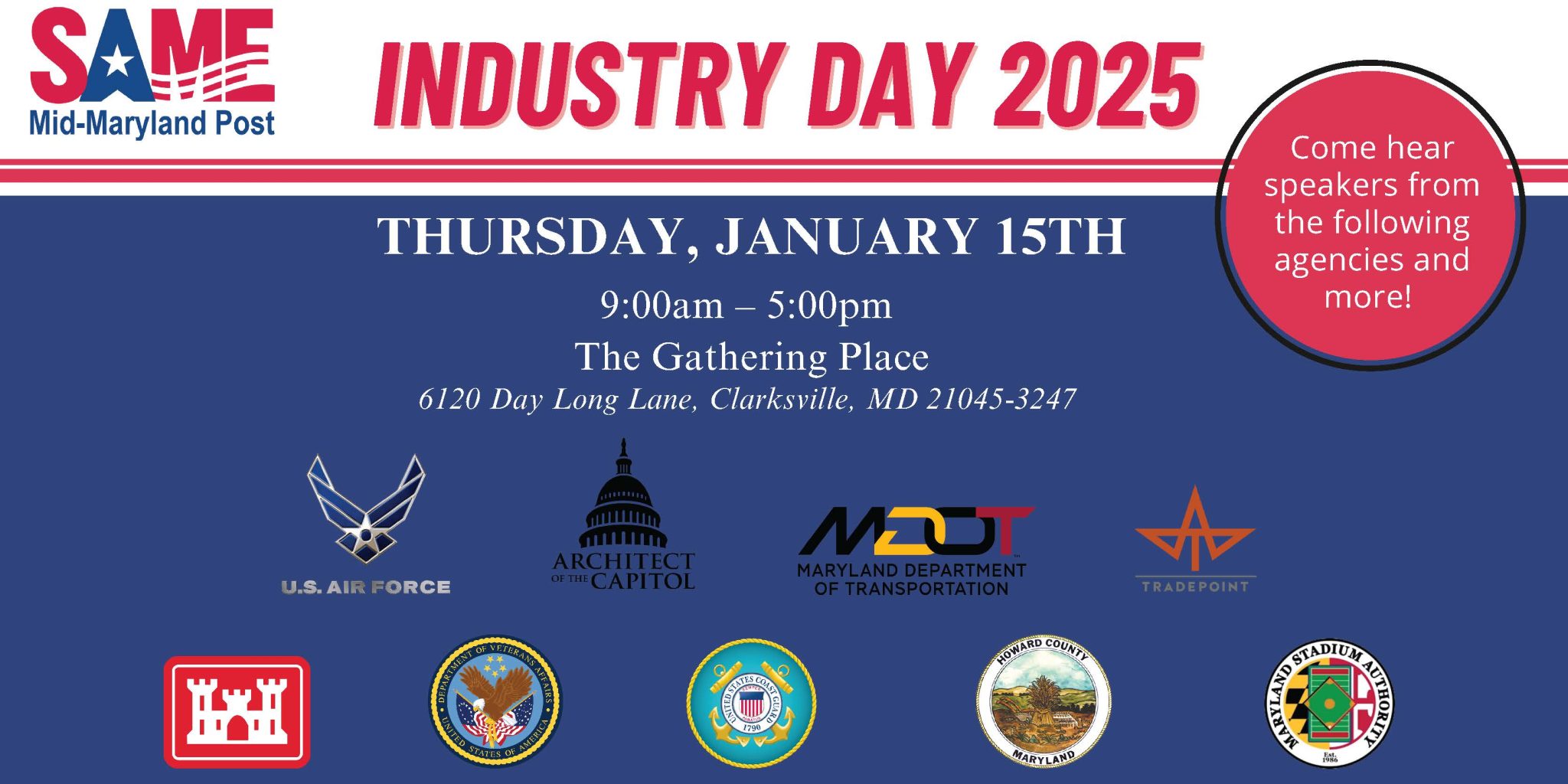 Join the SAME Mid-Maryland Post for an Industry Day on January 15th, featuring speakers from Federal and State Agencies! Our overall mission for this event is to foster Industry-Government Engagement (IGE) within and outside the Mid-Atlantic region. Our goal is to provide opportunities to strengthen relationships and to collaboratively solve problems. If you want to strategically prepare for FY26 and beyond, then this is the event to attend!
