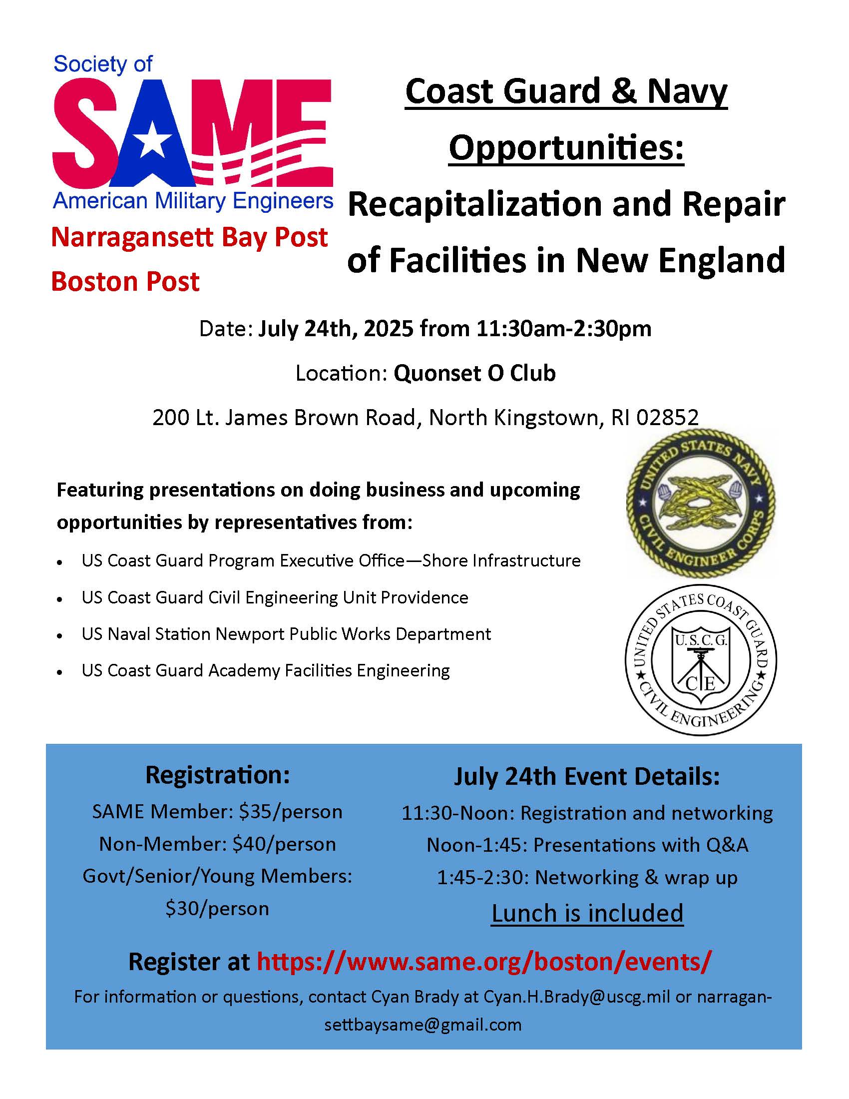 Please join the SAME Narragansett Bay Post (and Boston Post as well) for our “Coast Guard and Navy Opportunities: Recapitalization and Repair of Facilities in New England” luncheon event at the Quonset O Club at 200 Lt. James Brown Road in North Kingstown, RI on Thursday, July 24.