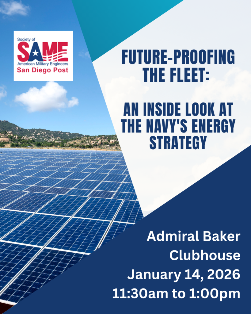 Join the SAME San Diego Post on January 14, 2026, for our January Luncheon. Join us for an exclusive briefing on the cutting-edge initiatives shaping the Navy’s approach to energy in our region from Jim McKechnie, the NAVFAC SW Energy Director. You’ll hear directly about how innovations in resiliency and efficiency are not just saving resources, but are actively strengthening our national defense. Discover how the Navy plans to “lighten the load and expand tactical reach” through smarter energy use.
