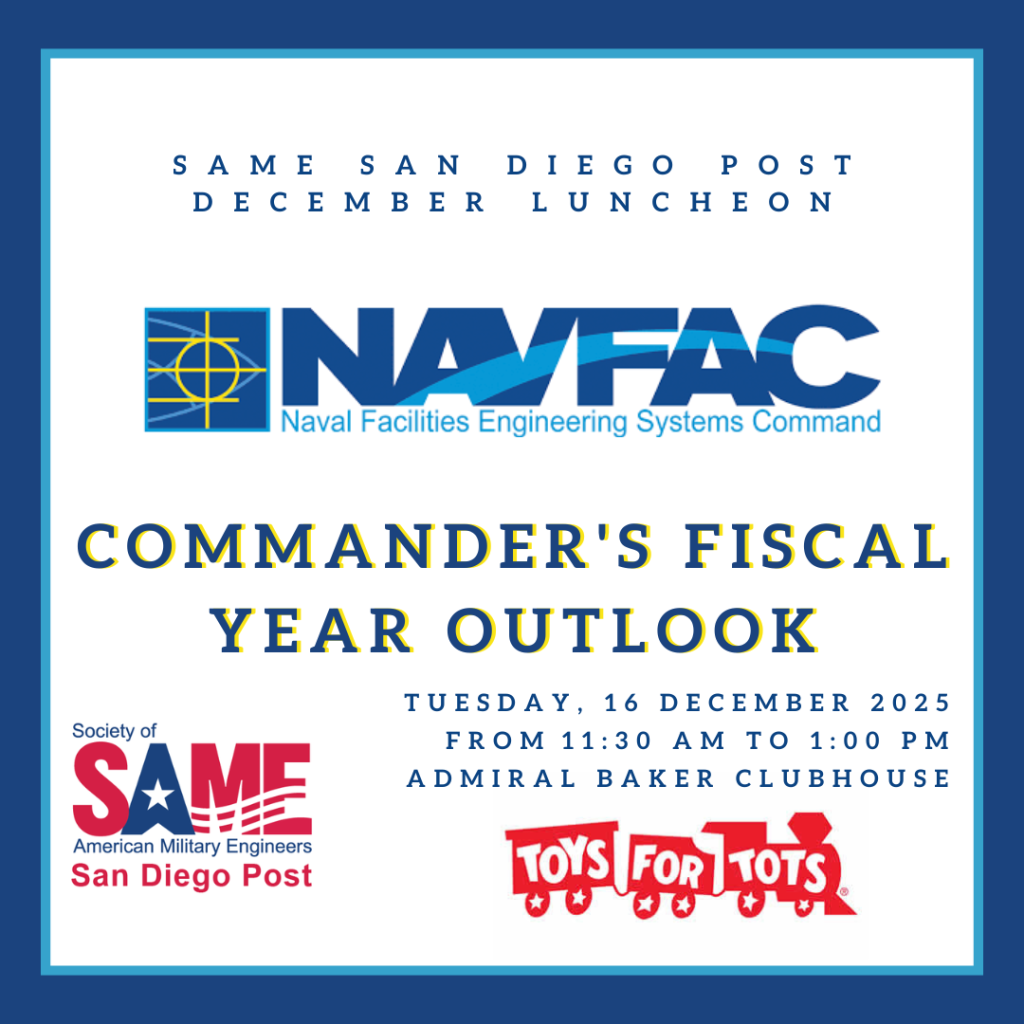 Join the SAME San Diego Post on December 16, 2025 for the NAVFAC Southwest Commander’s Fiscal Year Outlook. Captain Catherine Eyrich, Commanding Officer of NAVFAC Southwest, will share her vision for 2026. Secure your ticket now!