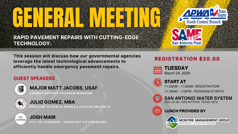The San Antonio Post is having its first joint Post Meeting with the South Central Texas Branch of the American Public Works Association (APWA) on Tuesday, March 24, 11:00 am – 1:00 pm. The presentations will be on Rapid Pavement Repair Technology (from the DOD and Public perspective). The speakers will be from AFIMSC and Cibolo and Converse TX governments. The event will be hosted by the APWA Branch at the SAWS Main Office facility. Registration will be through the APWA Chapter. Click HERE to register.