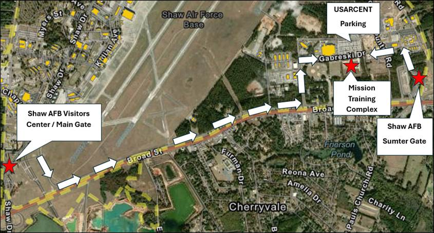 Visitors needing to obtain a visitor’s pass should access the Main Gate. Visitors with existing base access can access the Sumter Gate.