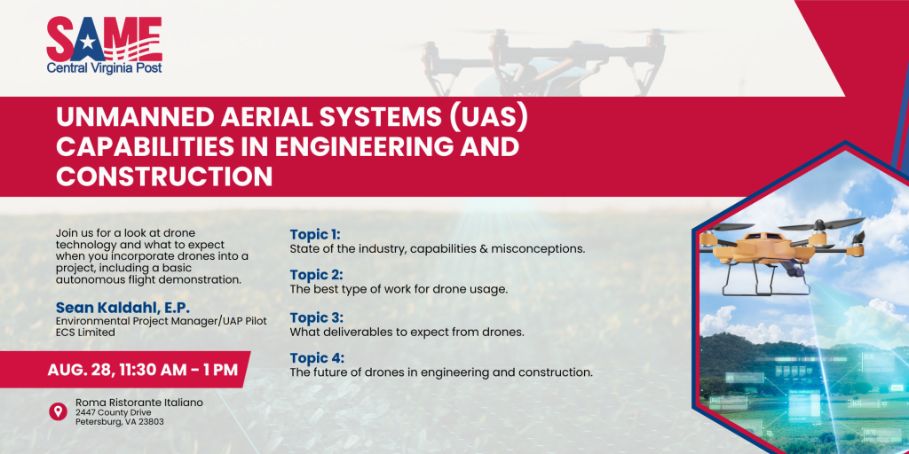 Join the SAME Central Virginia Post on August 28, 2025. We’ll get a look at drone capabilities from Sean Kaldahl, E.P., a drone pilot with ECS Limited, followed by a basic autonomous flight demonstration.