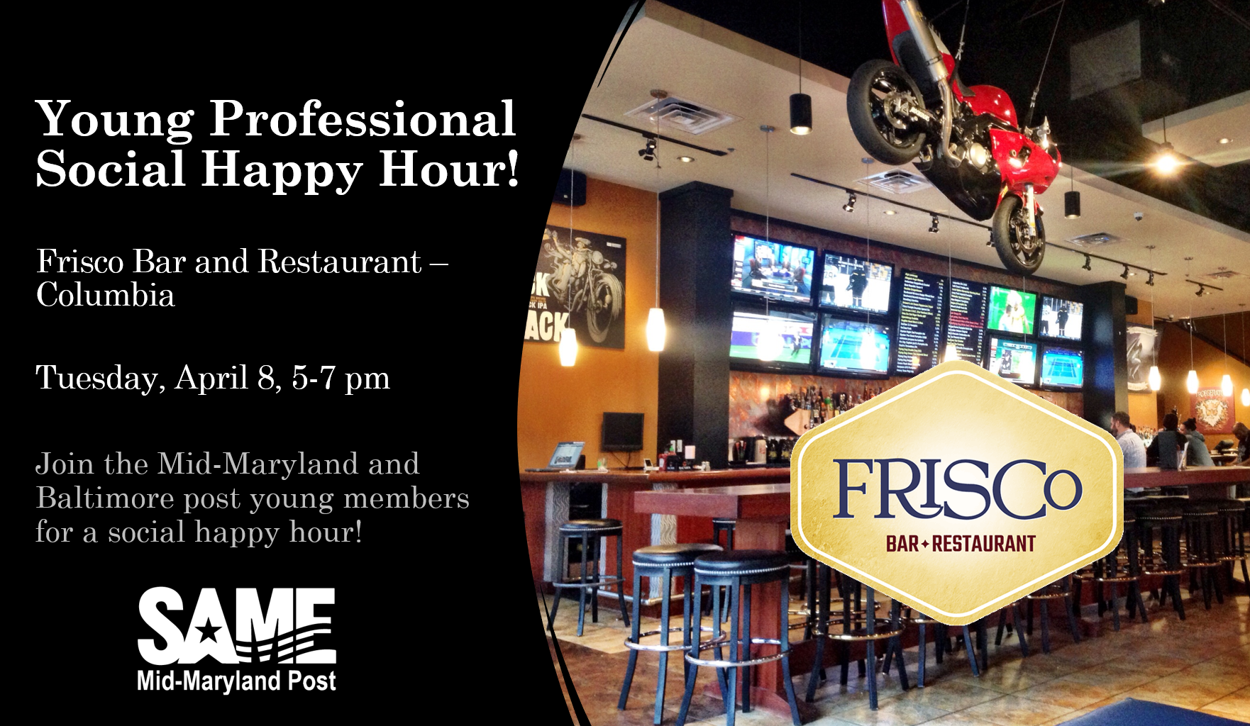 Join the Mid-Maryland and Baltimore post young members for a social happy hour from 5-7pm! Come on out and bring a friend to network with your peers in a relaxed setting.