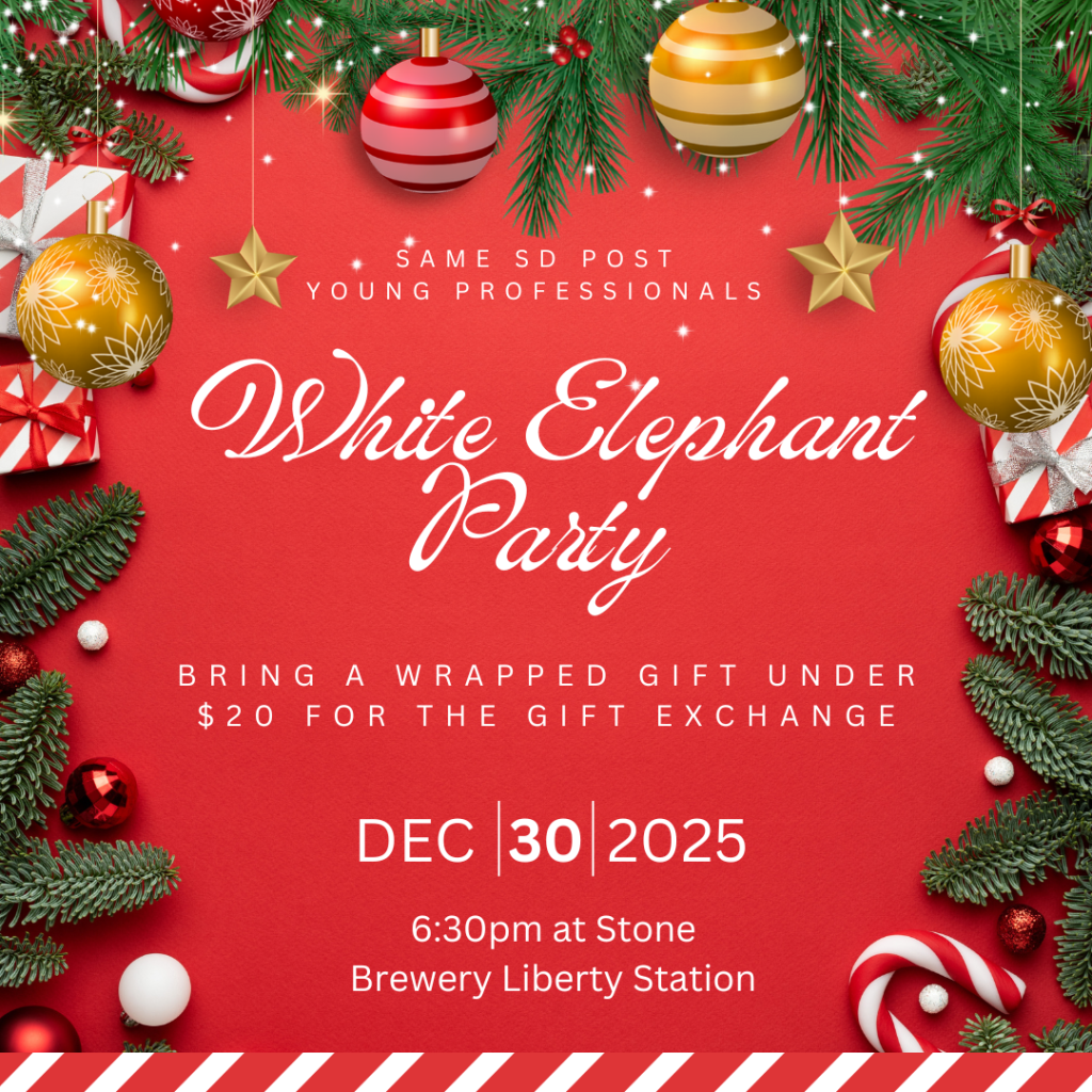 Join us for the SAME San Diego Post Young Professionals White Elephant Party! Come to Stone Brewing at Liberty Station on Tuesday, December 30, 2025 at 6:30 PM for an evening of fun, laughter, and connection with fellow young professionals. Bring a wrapped gift for the White Elephant exchange up to $20, and let the holiday magic unfold. We can’t wait to see you there!