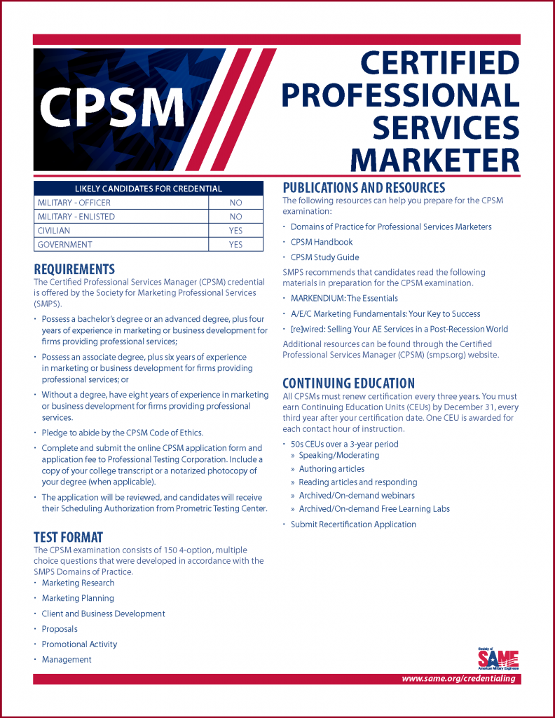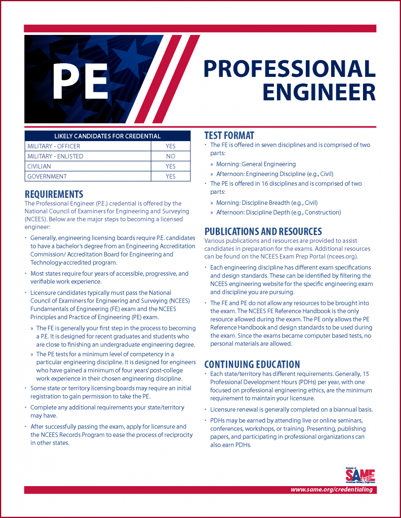 Many members of SAME hold one or more professional licenses—everything from Registered Architect, Certified Professional Services Marketer, Project Management Professional, and, of course, Professional Engineer. However, sifting through the variety of credentials available can sometimes be overwhelming. While acquiring a credential can open up new and better career paths for members, locating resources about where those career paths may lead isn’t always easy.