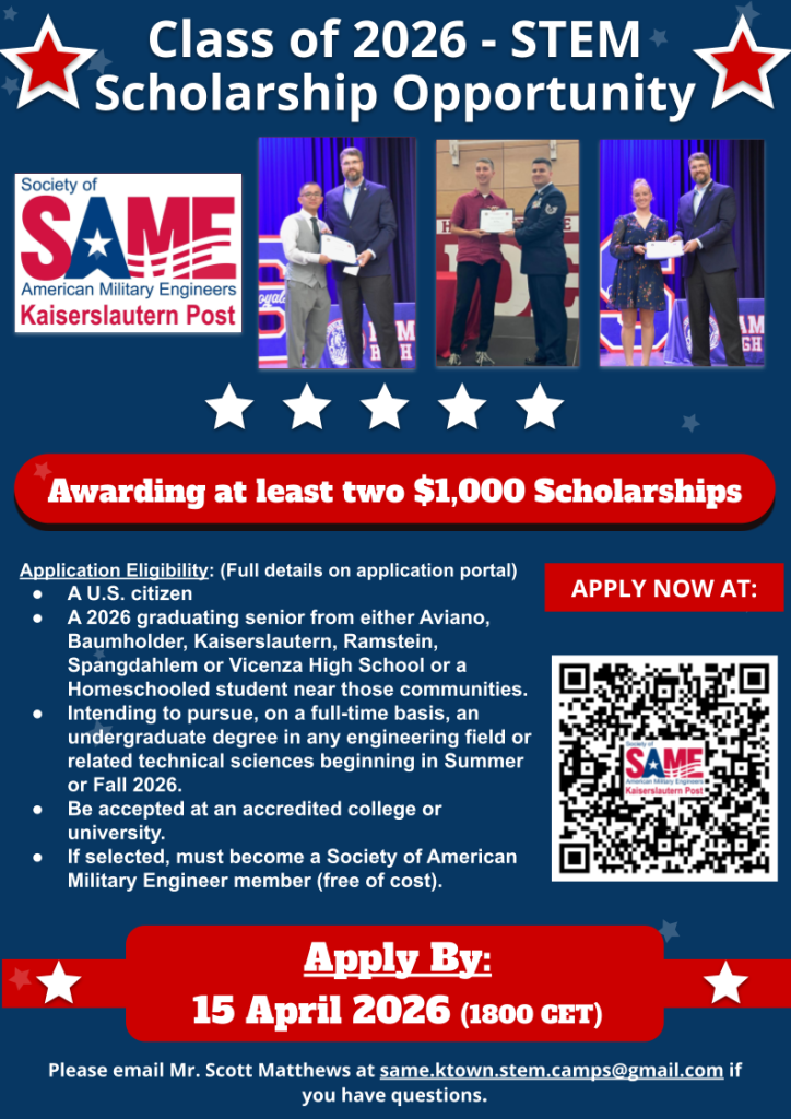 Again in 2026, the Kaiserslautern Post is offering at least two $1,000 scholarships exclusively for graduating seniors interested in pursuing careers in STEM (Science, Technology, Engineering, or Mathematics) fields. These scholarships are aimed at supporting students who demonstrate promise and passion in these areas.