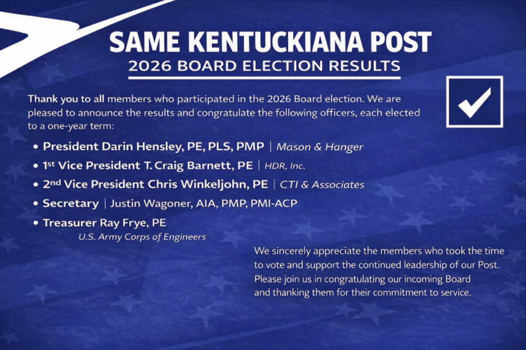 The Kentuckiana Post accomplishes this goal locally by supporting monthly luncheon meetings and other professional/social activities attended by members of local government, military, private industry, students and other interested parties. These meetings are announced via our e-mail distribution list and quarterly newsletter. We are supported by the national Society of American Military Engineers and publications such as The Military Engineer, which also promotes the interests and goals of our Society and its members. Please peruse our website to discover the benefits of SAME Kentuckiana Post membership.