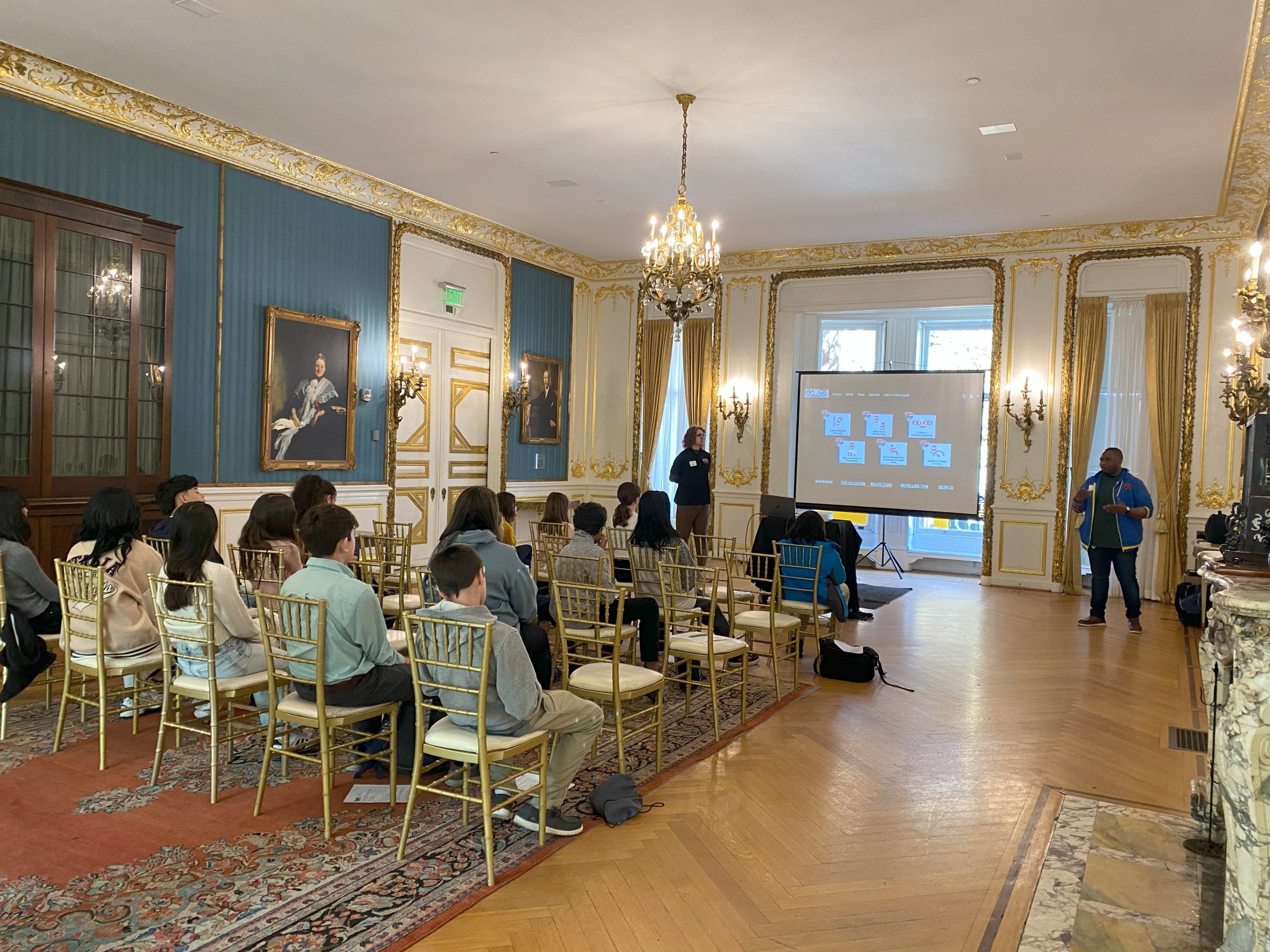 On April 8, 2025, the SAME Baltimore Post held the Easy as Pi STEM event at the historic Garrett-Jacobs Mansion home to the Engineer’s Club in downtown Baltimore. Easy as Pi Co-Chairs Rosemarie Potocky (from Arcadis) and Ivy Harvey (from EA Engineering, Science, and Technology, Inc., PBC) organized the event. Approximately 90 middle school students from Anne Arundel County and Baltimore City were in attendance. The day included 3 one-hour sessions where students were divided into five smaller groups based on their interests. During each session, students learned about different STEM fields and were given the opportunity to learn, interact, play games, build, and ask questions. Speakers included representatives from the following organizations: