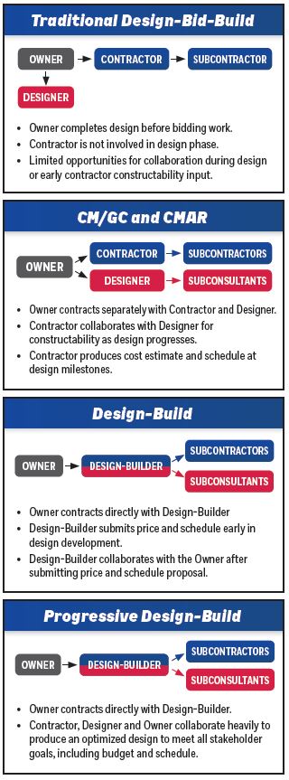Collaborative delivery, also referred to as alternative delivery methods, are contract models involving QBS selection and negotiated pricing for construction. Collaborative delivery methods have been widely used in the private sector for decades and include design-build (DB), PDB, CM/GC and CMAR. They optimize Early Contractor Involvement (ECI) by allowing for integrated design and construction where the owner, design-builder, and other stakeholders are working together toward a common goal from the very beginning of the project. This allows risk to be addressed early in the process. It also allows for early scope alignment and the collaborative development of cost and schedule. This type of collaborative approach results in the ability to develop accurate, well-informed cost and schedule estimates at the beginning of construction and early cost and schedule certainty.