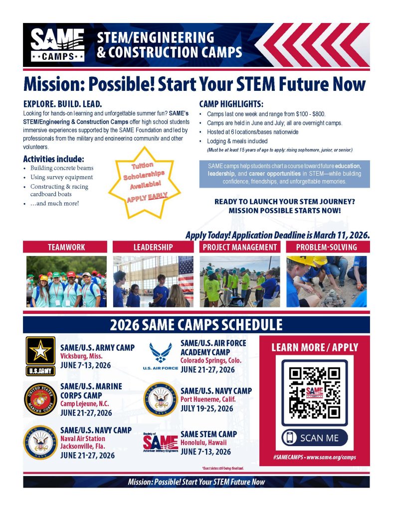 | ***The Pittsburgh Post offers FULL SCHOLARSHIPS, including travel, for students to attend the SAME STEM Camps**** Do you know a high school student who loves diving into the worlds of science, technology, engineering, and math, who thrives on creative challenges and hands-on learning? The Society of American Military Engineers (SAME) Pittsburgh Post annually sponsors full tuition scholarships for students to attend the SAME STEM/Engineering & Construction Camps. This opportunity provides unmatched learning opportunities, hands-on activities, and mentoring by professionals. Interested students must apply and be accepted to a SAME STEM/Engineering & Construction Camp in order to be considered for the scholarship. |