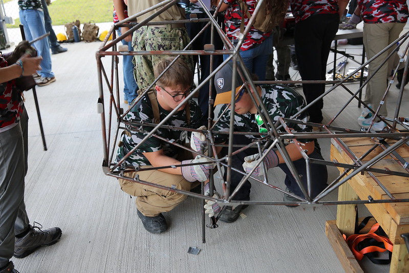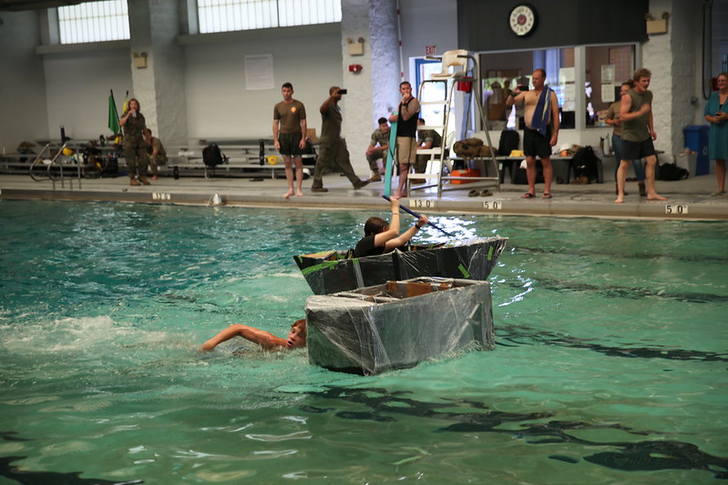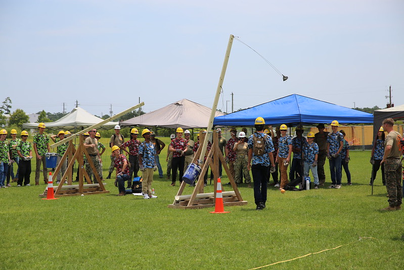 As campers arrived at Camp Lejeune they were welcomed by a team of dedicated volunteers who kept the energy high with casual games of frisbee and basketball until they were formed into their squads. On Monday, the campers were spent the morning at a leadership and team building exercise and later, the design and construction of a concrete beam. The rest of the week followed that energy with activities like the construction and testing of a trebuchet, a straw bridge competition, orienteering and military activities, field trips, and computer modeling. The cardboard boat competition is an annual favorite. It involves the design, construction, and racing of each squads’ handmade boat, and truly brings out the creativity and competitive spirit of the squads.