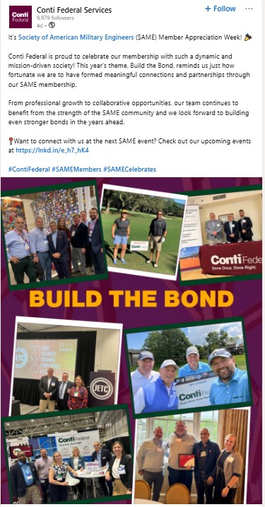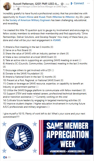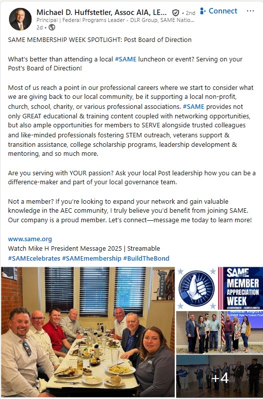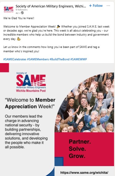 Our third annual Member Appreciation Week spotlighted the members across Posts, Regions, and Communities, Councils, and Committees who make the Society such a special place. The week kicked off with a video message from 106th National President Mike Huffstetler, Assoc. AIA, LEED AP, F.SAME, who shared the many benefits of membership in the SAME family. Giveaways, trivia, celebrations and recognitions filled the rest of the eventful week.
