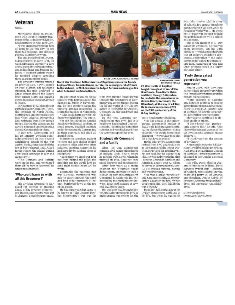 After the war, Ed Morrissette earned a civil engineering degree and worked as a traffic engineer for Virginia DOT and the Strategic Air Command (SAC) in California, which eventually brought him to Offutt Air Force Base. In the mid-1970s, he retired from SAC and worked at Omaha Public Power District.