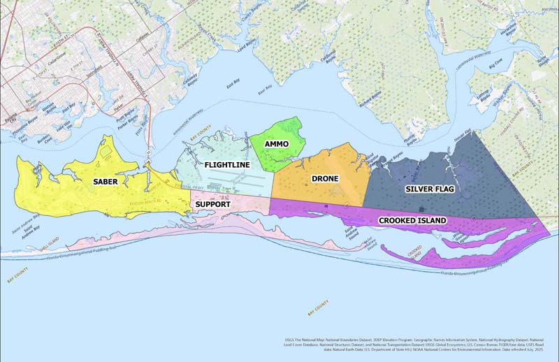 Typically, a planning effort of this size takes close to three years, but planners only had six months. In December 2018, a contract was awarded to AECOM to support the expedited effort. And the PMO applied the existing 2015 Installation Development Plan to achieve a resilient, right-sized installation. After much consideration and narrowing down district areas of the base, planners focused primarily on three sections: Flightline, Support, and Crooked Island. Leadership set the planning goals of resiliency, adaptability, and sustainability.