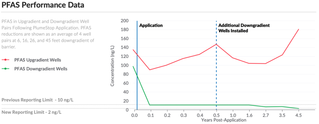 A PlumeStop CAC permeable reactive barrier was installed within a PFAS-impacted area to evaluate plume stabilization under field conditions. Monitoring from paired upgradient and downgradient wells showed rapid concentration reductions following installation and downgradient total PFAS concentrations have remained near reporting limits for 4.5 years, while upgradient concentrations remain elevated. No rebound trend has been observed. The application required hydraulic disruption or above-ground infrastructure expansion.