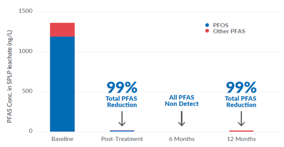 SourceStop CAC was evaluated within vadose soils in a separate AFFF source area at Camp Grayling to evaluate its effectiveness at preventing PFAS leaching to groundwater. The treatment resulted in over 99 percent reduction in total PFAS leachability, sustained through 12 months of monitoring. This source-area application provided a validation that CAC treatment can effectively reduce PFAS mobility in soils with elevated contaminant loading.