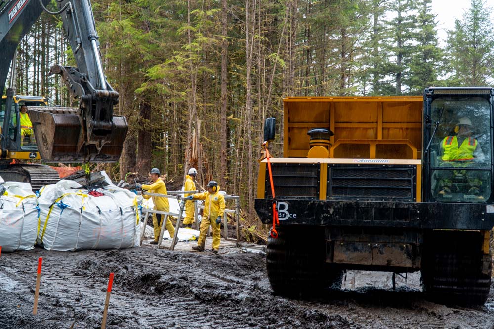 As a remote, off-the-grid site, Fort Babcock presented challenging field conditions. The island is accessible only by barge or landing craft. The temperate rainforest climate of the Tongass National Forest, which the grounds are located within, means lots of rain and extreme mud, testing the limits of people and equipment. With a local bear population as well, safety was top of mind. In addition, strict compliance with regulations and multiple stakeholder expectations guided every aspect of project planning and execution to protect nesting eagles, migratory birds, old growth forest, and World War II archaeological resources. Finally, a change in scope due to conditions encountered in the field amplified the already complicated logistics.