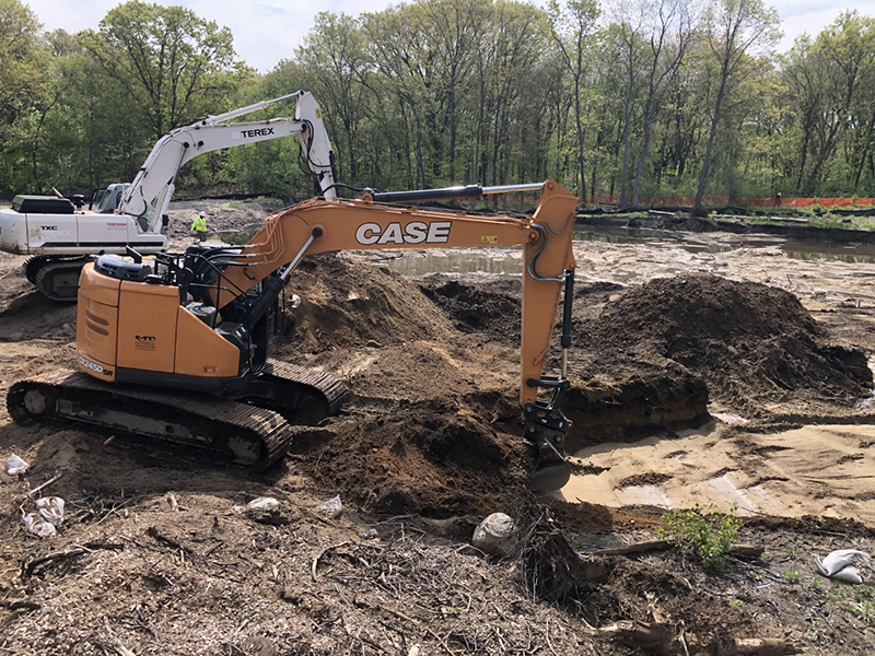 Waste and Resource Management. To manage the excavated material, the field team implemented a comprehensive waste and resource management plan. Soil was analyzed for disposal suitability at federally approved facilities or for beneficial application at a state-approved landfill set aside for future use as a solar farm. Trees removed before excavation were repurposed. Hardwood and softwood trunks were transported off-site. Branches and brush were chipped and used for dust suppression on-site, saving on mulch and disposal costs. Stumps were chipped, segregated from contaminated soil, and transported to disposal facilities. This testing and redistribution of resources minimized waste and ensured harmful pollutants did not re-enter the environment.
