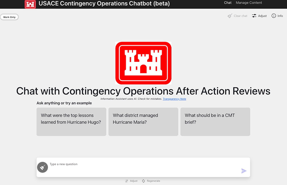 USACE generates massive amounts of data before, during, and after catastrophic events. This collection of information captures areas for improvement, and is supremely useful when a new response occurs. Traditionally, data had been in disparate locations, which made it hard to parse quickly.