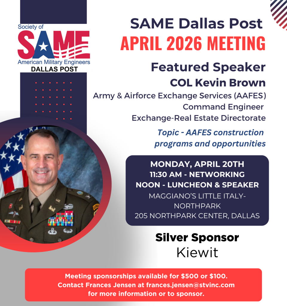 Our previously scheduled presentation on data centers will be rescheduled for a future date. For our April meeting, we are pleased to feature Col. Kevin Brown, AAFES Command Engineer, Exchange–Real Estate Directorate. Col. Brown will discuss AAFES construction programs and upcoming opportunities.